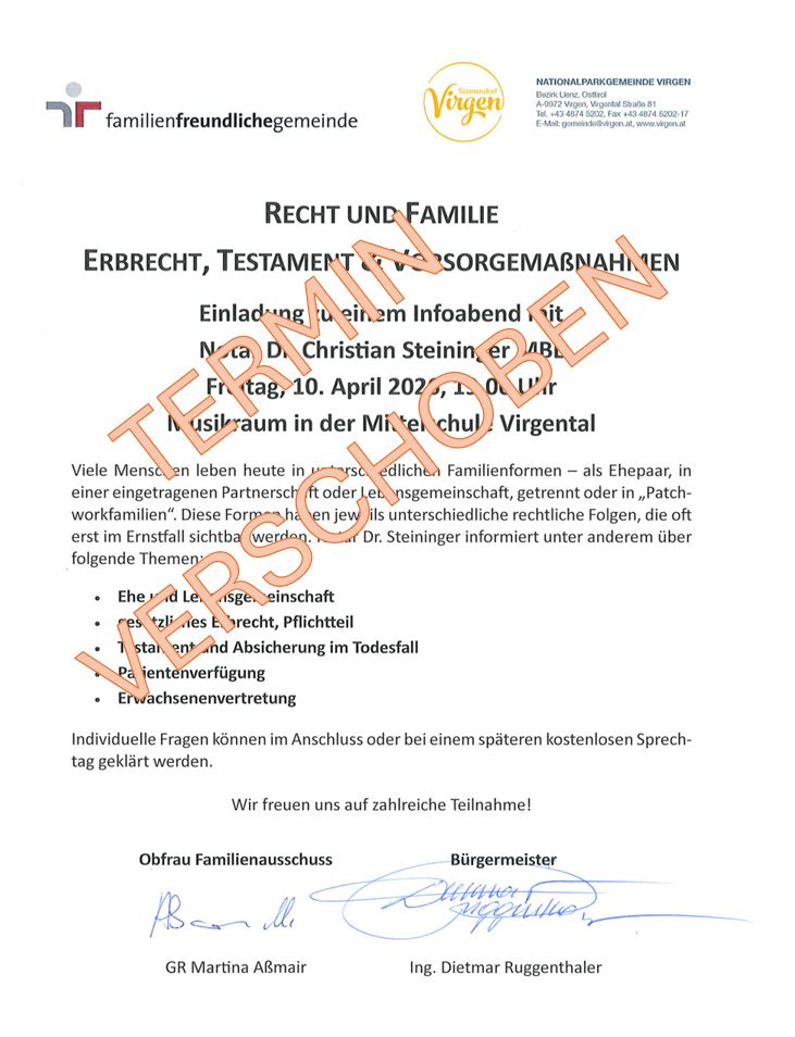 Ab sofort ist die elektronische Zustellung von Vorschreibungen, Rechnungen, etc. der Gemeinde Virgen in Form eines E-Mail möglich und die Verwaltungsabläufe können dadurch weiter optimiert werden.